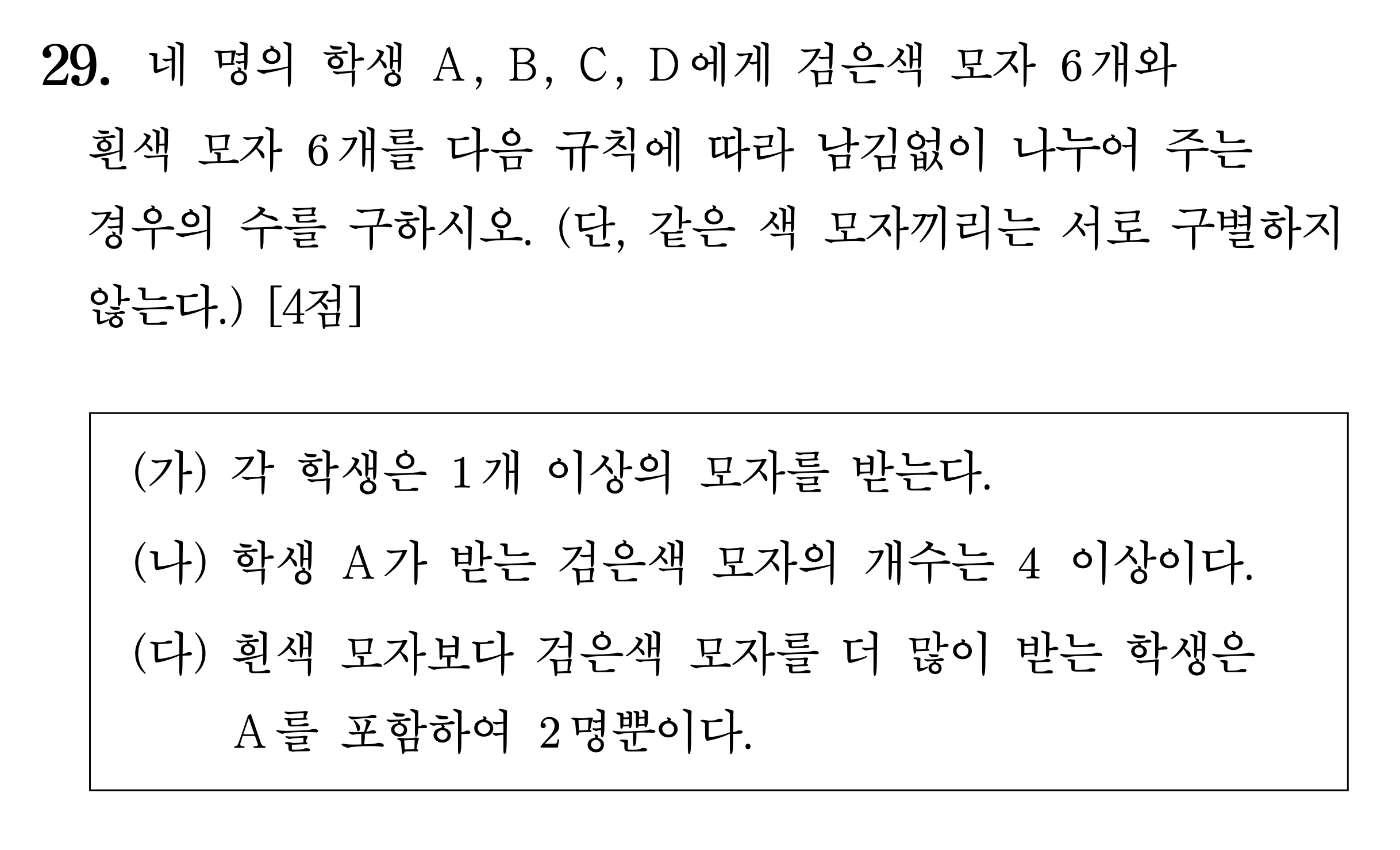 경우의 수 문제다. 29번 정도되는 확통 문제는 순열 조합 한두 번으로 끝나지 않을 가능성이 높기 때문에 마음의 준비를 하자.